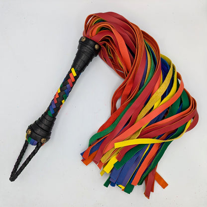 A spectacular flogger made with matched-weight leather in the 6 colors of the traditional pride flag, or in the updated 8-color inclusive philly pride rainbow. We don't do things halfway: these floggers have rainbow falls and a rainbow braided handle. Metallic rainbow also available on request.