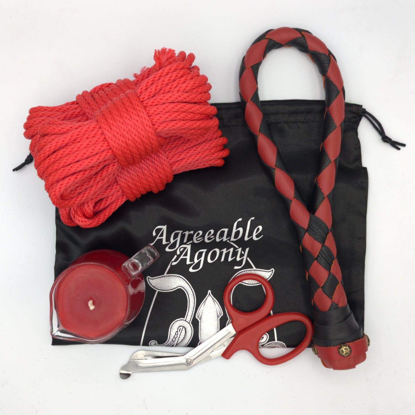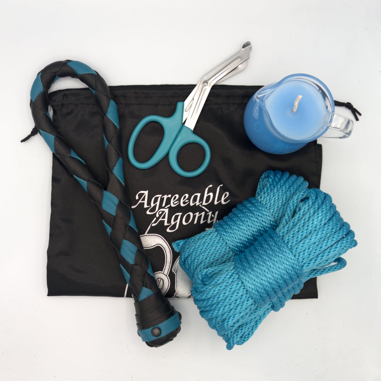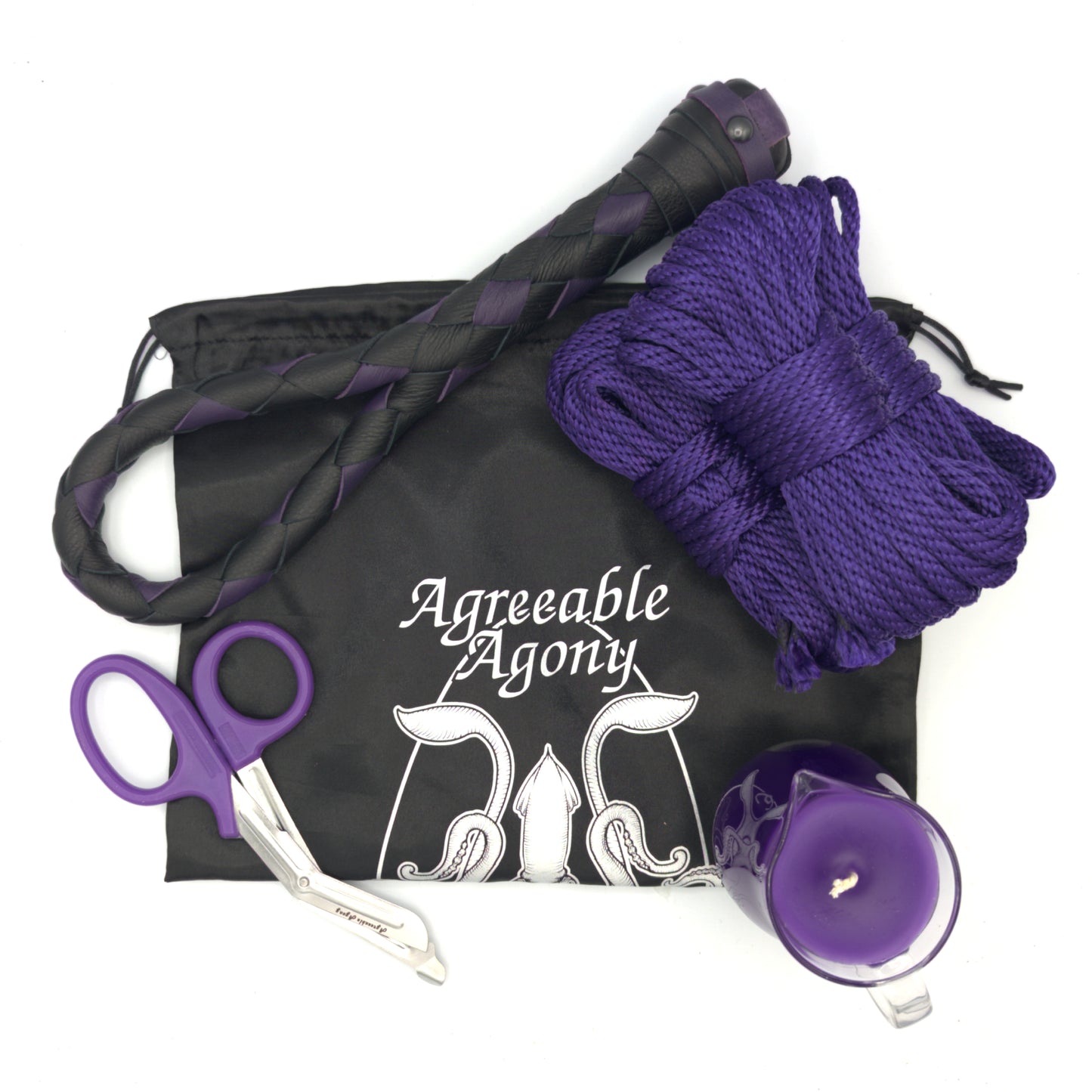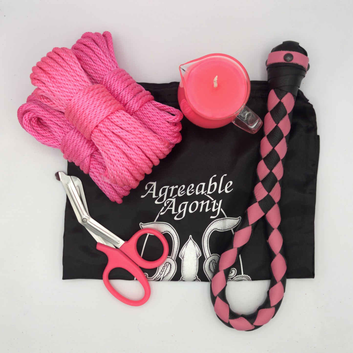 A kit that has a little bit of everything: an impact toy paired with a wax play pitcher, with an optional bondage add-on!