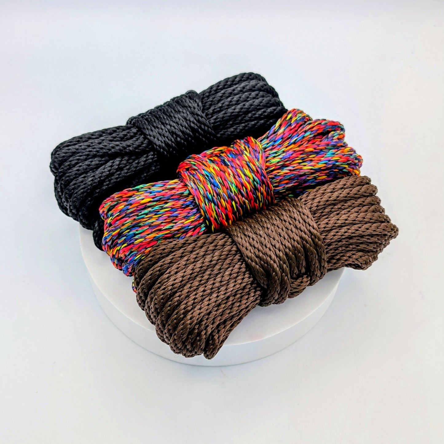 Top quality 100% MFP bondage/suspension rope. MFP (multifilament polypropylene) is a waterproof rope that is resistant to most oils and lubricants. Unlike dyed ropes, this rope is braided with pre-colored fiber so that the color is vibrant throughout and does not bleed or fade. The rope is machine washable and easily cared for. A PDF detailing our MFP’s full specifications, including break weights, can be found here. All of our MFP is braided to our specifications at a local rope facility; the rope is braided specifically with bondage/kink in mind, so that it’s soft and smooth on the skin while still holding a knot well. Cutting and finishing is done by us at our shop. The rope is heat sealed ~1/4” from the end.
