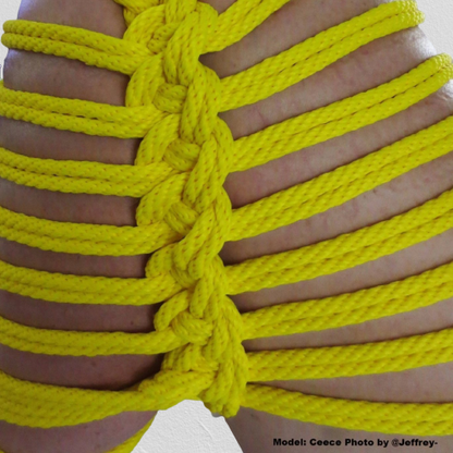 Top quality 100% MFP bondage/suspension rope. MFP (multifilament polypropylene) is a waterproof rope that is resistant to most oils and lubricants. Unlike dyed ropes, this rope is braided with pre-colored fiber so that the color is vibrant throughout and does not bleed or fade. The rope is machine washable and easily cared for. A PDF detailing our MFP’s full specifications, including break weights, can be found here. All of our MFP is braided to our specifications at a local rope facility; the rope is braided specifically with bondage/kink in mind, so that it’s soft and smooth on the skin while still holding a knot well. Cutting and finishing is done by us at our shop.