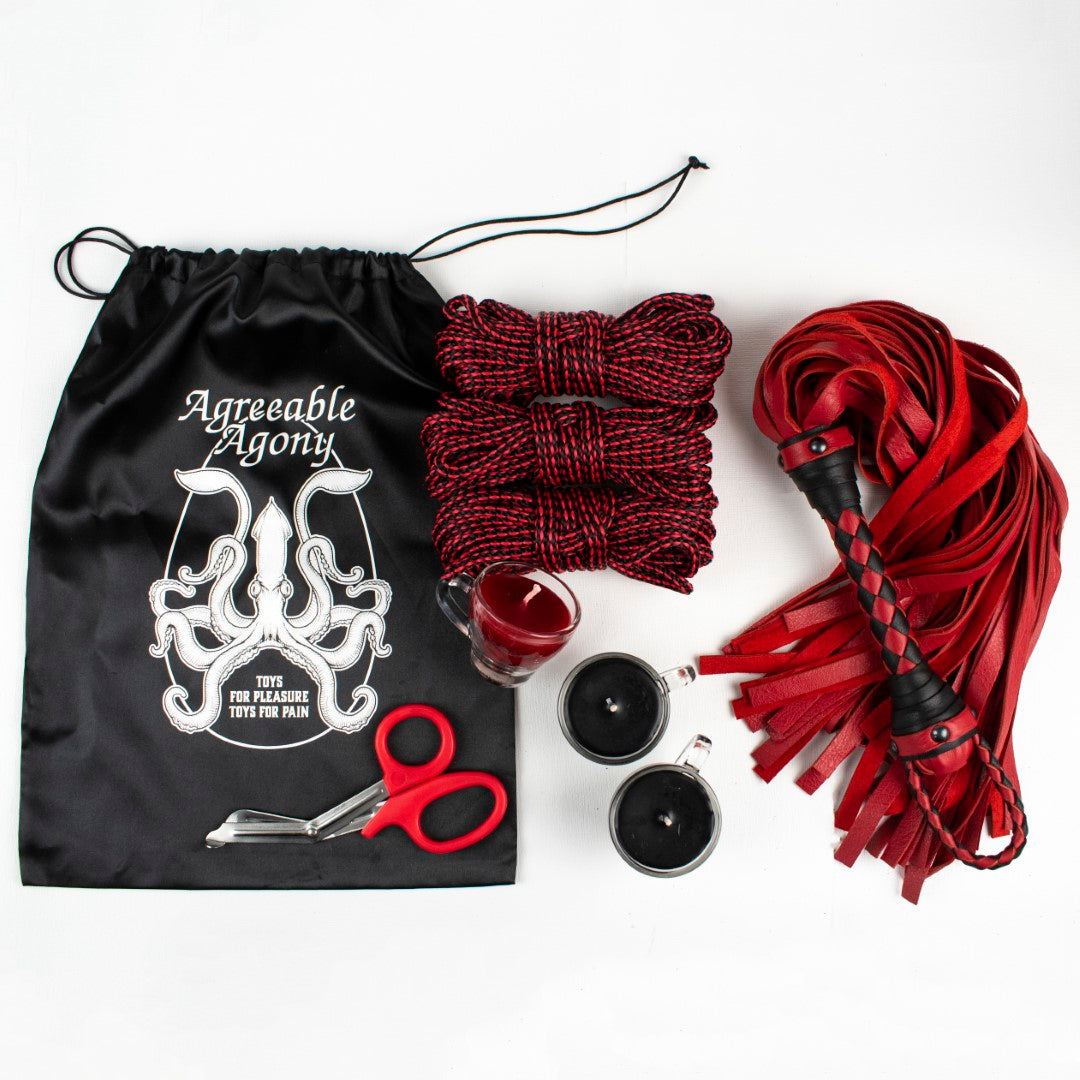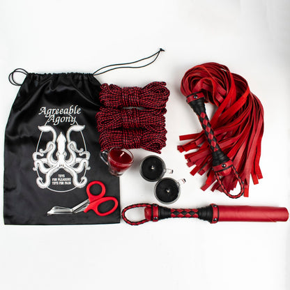 - But what about impact play you say? You get your choice of one of our iconic Leather Jacks or a beautiful Leather Flogger in colors to match your kit.