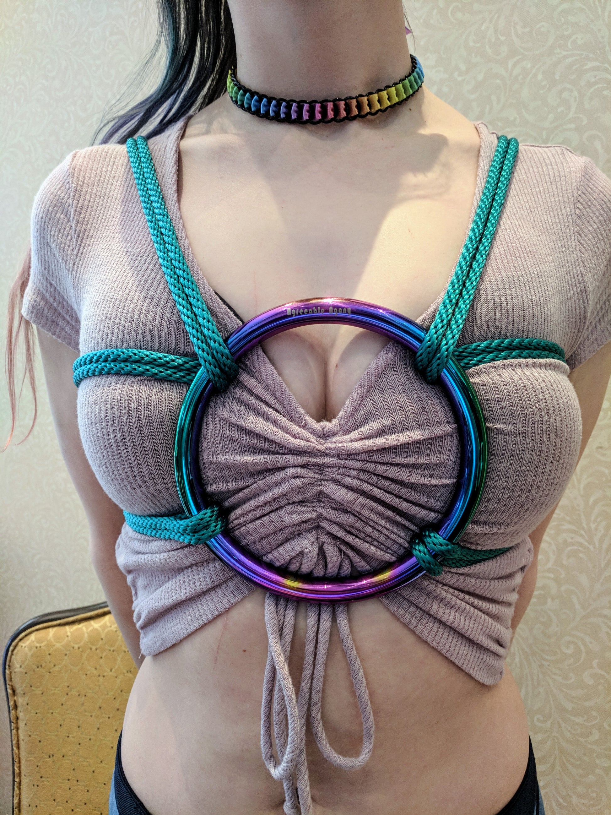 Our rainbow shibari rings are made from stainless steel, have a high polish steel finish applied, and then go through a titanium plasma bonding coat to apply a rainbow finish. This finish is different from a normal steel powder coat or an aluminum anodizing. The titanium coat bonds to the steel and will not rub off or wear away. Like any metal it can be chipped or scored with enough force, but it will not wear off from regular rope use.