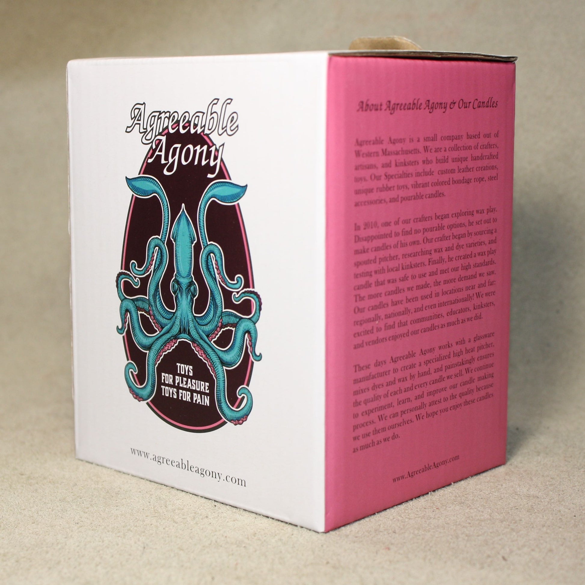 All candles are made of 100% pure paraffin. Temperature is 124°F. Adjusting distance from body will adjust pouring temp slightly as well. Full sized pitcher jars hold 266ml or ~9oz of wax.