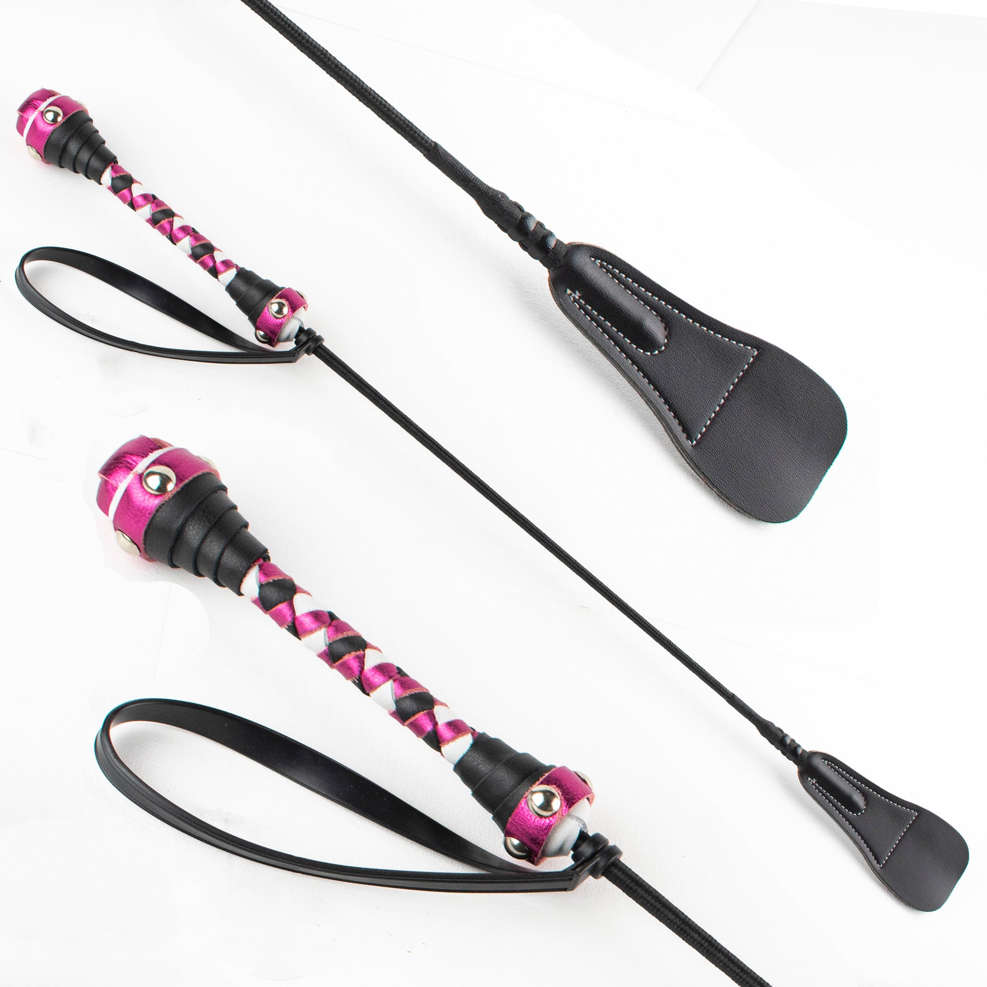 Nous proposons également une poignée en cuir personnalisée pour votre cravache, assortie au style emblématique de vos autres accessoires de domination Agreeable Agony. Nos poignées personnalisées peuvent être réalisées avec une ou deux couleurs et un choix limité de tresses (voir photo).