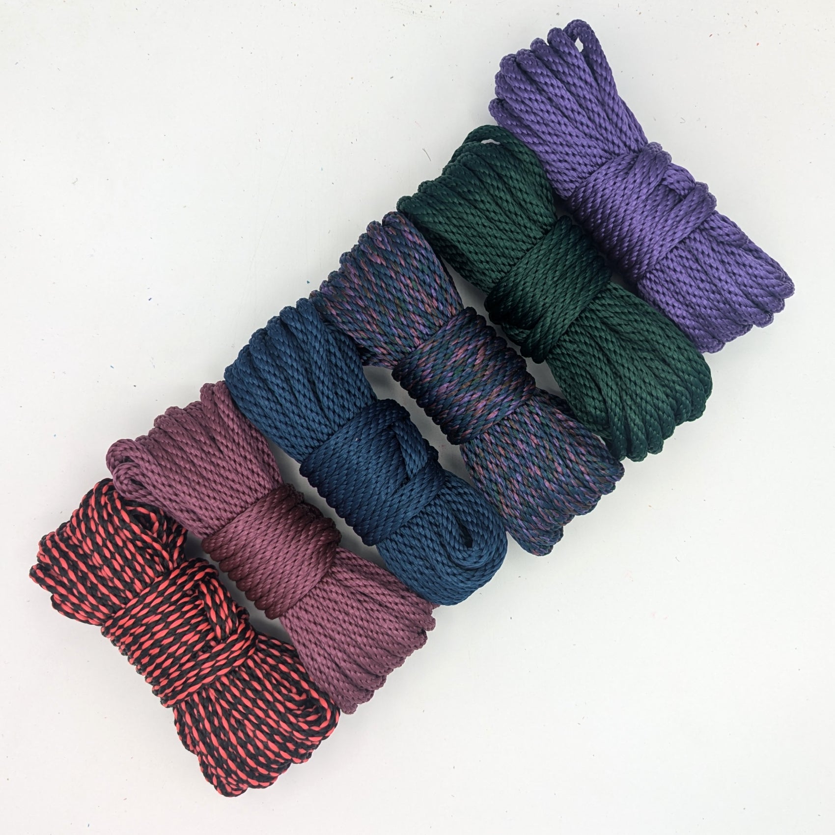 Top quality 100% MFP bondage/suspension rope. MFP (multifilament polypropylene) is a waterproof rope that is resistant to most oils and lubricants. Unlike dyed ropes, this rope is braided with pre-colored fiber so that the color is vibrant throughout and does not bleed or fade. The rope is machine washable and easily cared for. A PDF detailing our MFP’s full specifications, including break weights, can be found here. All of our MFP is braided to our specifications at a local rope facility; the rope is braided specifically with bondage/kink in mind, so that it’s soft and smooth on the skin while still holding a knot well. Cutting and finishing is done by us at our shop. The rope is heat sealed ~1/4” from the end.